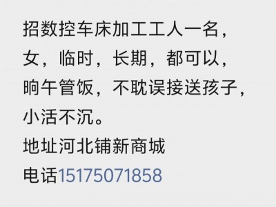 招数控车床加工工人一名,女,临时,长期,都可以,晌午管饭,不耽误接送孩子,小活不沉。 地址河北铺新商城