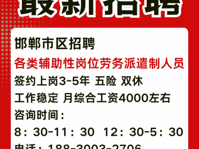 邯郸市区招聘各类辅助性岗位劳务派遣制人员。签约上岗3-5年,五险,双休,工作稳定,月综合工资4000左右。