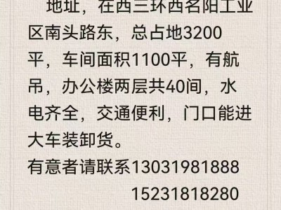 厂房出租,总占地3200 平,车间面积1100平 有航吊,办公楼两层共40间,水电齐全,交通便利,门口能进大车装卸货 地址,在西三环西名阳工业区南头路东