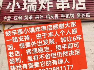 岐辛寨小瑞炸串店,由于本人个人原因,想要外出发展,转让6年老店, 客源稳定,接手即可盈利,转给有需要它的有缘人。 地址:河北省邯郸市永年区大北汪镇