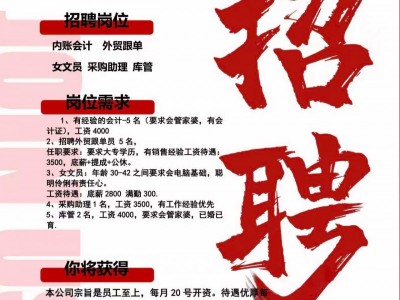 职位要求: 细心严谨、责任心强,坚持质量原则,不弄虚作假,沟通协调顺畅,能对接业务、工厂、仓库推进整改。,年龄30-45岁以内。薪酬福利:月薪4K+三险)(要求已婚已育)