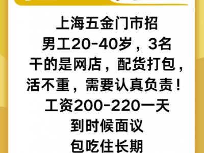 上海五金门市招男工20-40岁,3名, 干的是网店,配货打包,活不重,需要认真负责!工资200-220一天,到时候面议!包吃住长期干。联系电话:13816053201,13661685884