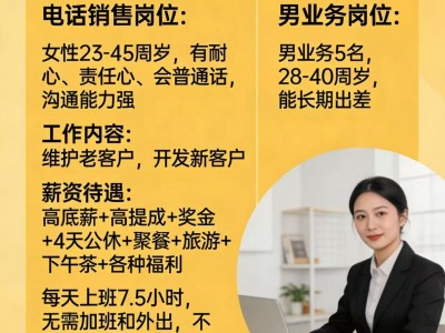 薪资待遇:高底薪➕高提成 ➕奖金➕4天公休➕聚餐➕旅游➕下午茶➕各种福利 每天上班7.5小时,无需加班和外出,不耽误接送孩子上下学,综合薪资5000➕