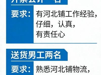 开票会计一名。要求有河北铺工作经验。仔细,认真。有责任心。