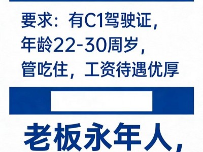 天津标准件门市招工1名,要求有C1驾驶证,年龄22-30周岁,工资待遇优厚,管吃住,老板永年人,混天勿扰