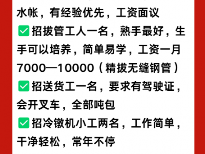 ✅招拔管工人一名,熟手最好,生手可以培养,简单易学,工资一月7000—10000(精拔无缝钢管)