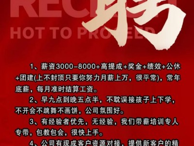招聘网络销售 薪资待遇3000—8000高提成奖金绩效公休(常年底薪每月准时发工资) 早九晚五,不耽误接送孩子,公司范围好,有经营者优先,无经验者公司免费培训 要求年龄23已上,女士优先,积极乐观,口齿伶俐,有上进心,有责任心,混天者勿扰。 地址:河北省邯郸市永年区富强路