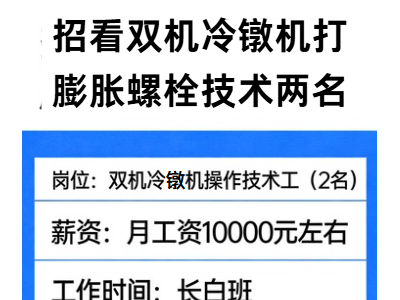 招看双机冷镦机打膨胀螺栓技术两名,月工资一万左右,长白班,经常活,要求事少责任心强的联系