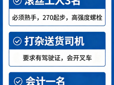 滚丝工人3名,必须熟手270起步,高强度螺栓